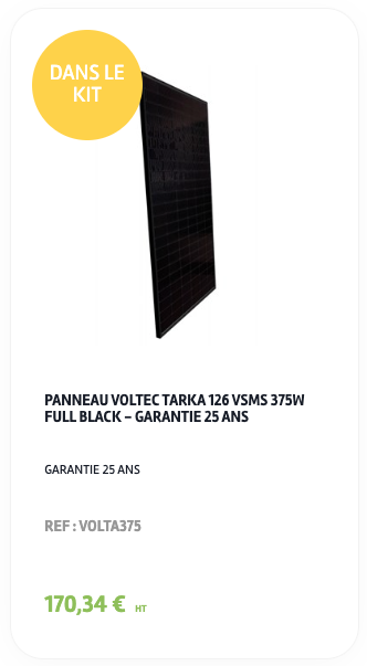 - Découvrez également notre kit de 8 panneaux Voltec Solar, composé de belles références (avec le macaron jaune "dans le kit") garantissant une performance optimale :
