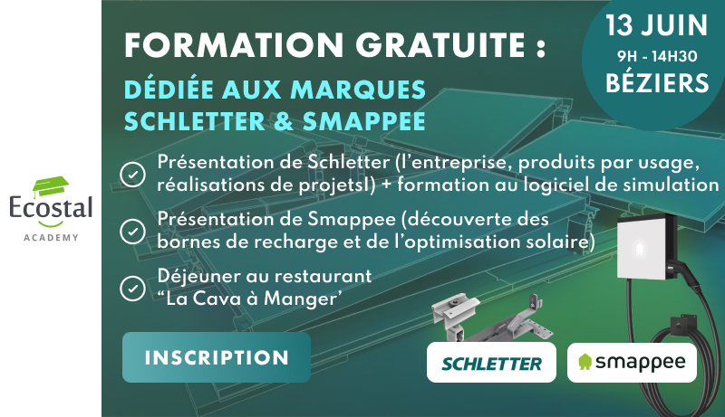 Grâce à nos partenaires Schletter et Smappee, nous avons l'honneur d'organiser à Béziers une formation exclusive et totalement GRATUITE destinée aux installateurs PV voulant en savoir plus sur ces 2 marques de produits à la pointe dans leur catégorie.