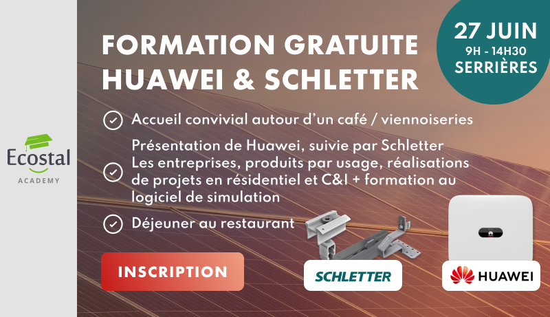 Réservez sans plus tarder votre place pour notre journée de formation Ecostal Academy dédiée aux marques / gammes Huawei et Schletter.
