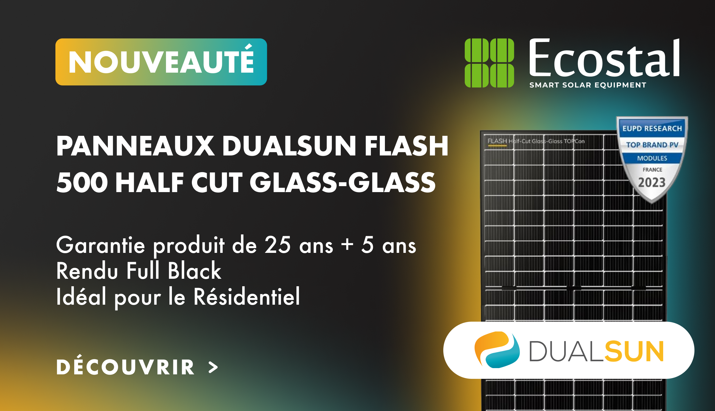 Ecostal, votre distributeur de panneaux solaires de référence, est fier de vous annoncer l'arrivée en stock du tout nouveau panneau de Dualsun, le Flash 500 Half Cut Glass-Glass !
