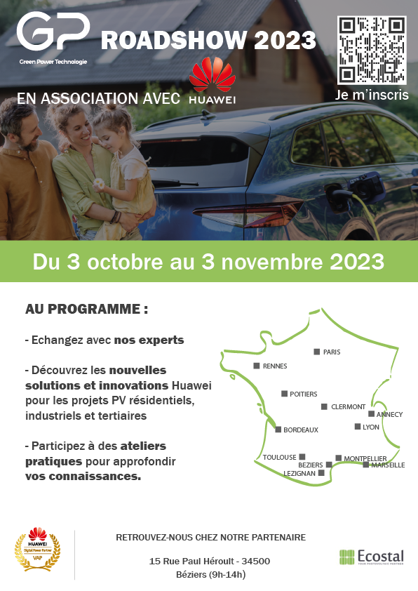 Ne manquez pas le Roadshow 2023 organisé par Green Power Technologie et Ecostal en association avec Huawei FusionSolar. À partir du 3 octobre 2023, découvrez les dernières innovations en matière de projets photovoltaïques, échangez avec des experts et participez à des ateliers pratiques. Un moment convivial vous attend, avec des options de restauration sur place.